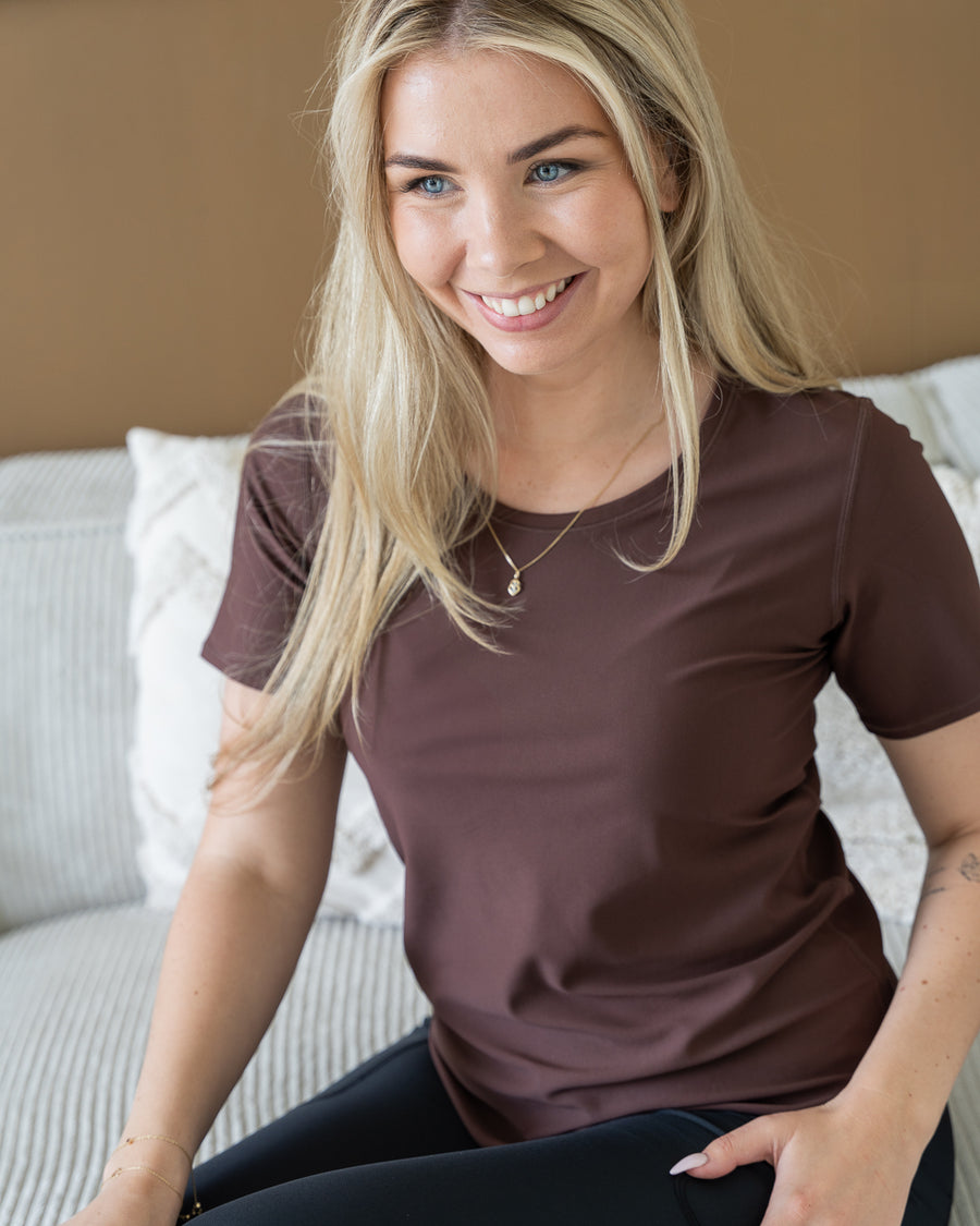 Zacht en aangenaam T-shirt van elastisch materiaal dat zich vormt naar het lichaam. Licht getailleerd en iets langer aan voor- en achterkant.